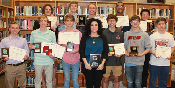 Front Row: Quinton Futrell- Standout Sophomore and Southwestern 2A Athletic All Conference; Davis Adcock - Standout Freshman & Southwestern 2A Athletic All Conference; Gage Adcock - Standout Junior & Southwestern 2A Athletic All Conference; Mary Ellen Lewis - Southwestern 2A Conference Men's Swimming Coach of the Year; Luke McMahan-Standout Junior & Southwestern 2A Athletic All Conference; Matthew Erickson - Men's Most Improved Swimmer; Carson Helton- Southwestern 2A Athletic All Conference